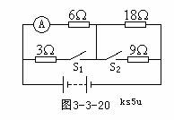 9.如图3-3-20所示的直流电路中,当S1断开、S2闭合时,电流表示数为3/5A;当S1闭合,S2断开时,电流表示数为2/15A.若S1、S2都闭合后,电流表的示数是多少?
