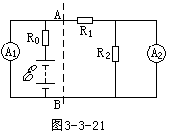 10.如图3-3-21所示直流电路中,A1、A2两只电流表完全相同,内阻均为r,A2的示数恰好是A1示数的1/n,已知A、B两点右侧的总电阻(将电路以虚线处断开测量A、B间的电阻)恰与电流表内阻r相等,试求R1、R2的阻值.