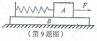 9.如图所示,两质量相等的物块A、B通过一轻质弹簧连接,B足够长、放置在水平面上,所有接触面均光滑。弹簧开始时处于原长,运动过程中始终处在弹性限度内。在物块A上施加一个水平恒力,A、B从静止开始运动到