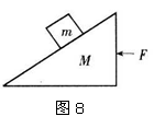 的斜面上,斜面的质量M=2kg,斜面与物体的动摩擦因数μ=0.2,地面光滑,现对斜面体施加一水平推力,如图8所示。要使物体m相对斜面静止,力F应为多大?设物体与斜面的最大静摩擦力等于滑动摩擦力。(
