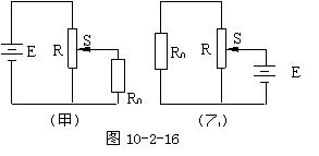 3.如图10-2-16(甲)所示电路,电源电动势为E,内阻不计,滑动变阻器的最大阻值为R,负载电阻为R0.当滑动变阻器的滑动端S在某位置时,R0两端电压为E/2,滑动变阻器上消耗的功率为P.若将R0与电源位置互换,接成图(乙)所示电路时,滑动触头S的位置不变,则( )