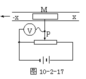 5.传感器可将非电学量转化为电学量,起自动控制作用.如计算机鼠标中有位移传感器,电熨斗、电饭煲中有温度传感器,电视机、录象机、影碟机、空调机中有光电传感器……演示位移传感器的工作原理如图10-2-17所示,物体M在导轨上平移时,带动滑动变阻器的金属滑杆P,通过电压表显示的数据,来反映物体位移的大小X,假设电压表是理想的,则下列说法中正确的是( )