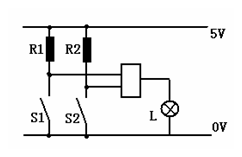 如图,一个应用某逻辑电路制作的简单车门报警图。图中两个开关S1和S2分别表示汽车的两道门。只要任意一个开关断开,小灯炮就发光。请根据以上要求列出该门的真值表并画出电路符号。