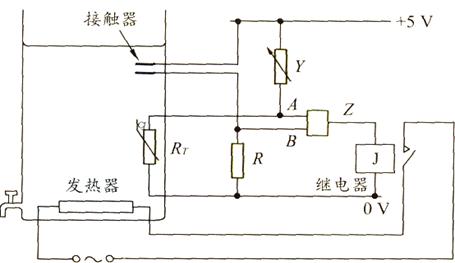 下图是温度和水位自动控制电路,Rr是热敏电阻,如果热水器中没有水或者水温较高时,继电器会放开弹簧片,发热器断路,反之会吸住弹簧片接通发热器.分析工作原理,并补上合适的逻辑门电路.