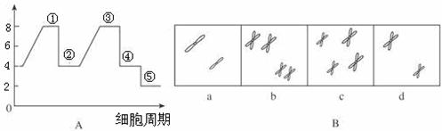(1)B图所示的a、b、c、d四个细胞内染色体的图像,分别是A图所示的①-⑤中的什么时期?(填图中的代号)