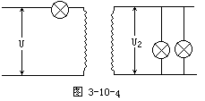 3.如图3-10-4所示,理想变压器的原线圈与灯泡A串联后,加上交流电压U1,副线圈两端电压为U2,接有B和C两个灯泡,若A、B、C是三个相同的灯泡,且均正常发光,则U1∶U2为: [ ]