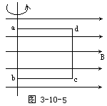 6.一个匝数为200的矩形线圈abcd位于匀强磁场中,磁感强度大小为0.8T.初始位置如图3-10-5所示,线圈以ab为轴匀速转动,角速度为5rad/s,已知ab=15cm,ad=10cm,线圈的总电阻是100Ω.求