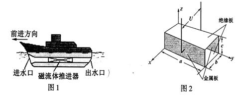 如图2所示,通道尺寸a=2.0m、b=0.15m、c=0.10m,工作时,在通道内沿z轴正方向加B=0.8 T的匀强磁场;沿x轴负方向加匀强电场,使两极板间的电压U=99.6V;海水沿y轴方向流过通道。已知海水的电阻率ρ=0.20 Ω·m。
