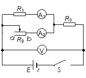 5(2007年河北唐山一中)在如图所示的电路中,E为电源电动势,r为电源内阻,R1和R3均为定值电阻,R2为滑动变阻器。当R2的滑动触点在a端时合上开关S,此时三个电表A1、A2和V的示数分别为I1、I2和U。现将R2的滑动触点向b端移动,则三个电表示数的变化情况是 ( B )