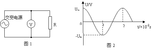 正弦交流电源与电阻R、交流电压表按图1所示的方式连接,R=100Ω,交流电压表的示数是100V。图2是交变电源输出电压u随时间t变化的图象,则 ( )