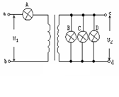 6、如图所示,A、B、C、D是四个相同的白炽灯,都处于正常发光状态,则图中ab、cd两端电压U1与U2之比是:( )