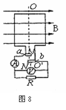 10、N匝矩形线圈长L1,宽L2,电阻为r,通过滑环M、N和电刷a、b与电阻为R的电阻组成闭合电路,电路中连有安培表和伏特表,现使线圈绕垂直于磁场方向的轴OO’以角速度