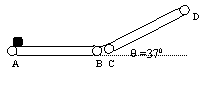 如图所示为粮站常用的皮带传输装置,它由两台皮带传输机组成,一台水平传送,AB两端相距3m;另一台倾斜,传送带与地面倾角θ=370,CD两端相距4.45m,B、C相距很近。水平部分AB以5m/s的速度顺时针转动,将质量为10kg的一袋米放在A端,到达B端后,速度大小不变地传到倾斜的CD部分,米袋与传输带间动摩擦因数为0.5。求: