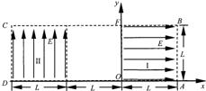 图为研究电子枪中电子在电场中运动的简化模型示意图。在Oxy平面的ABCD区域内,存在两个场强大小均为E的匀强电场I和II,两电场的边界均是边长为L的正方形(不计电子所受重力)。