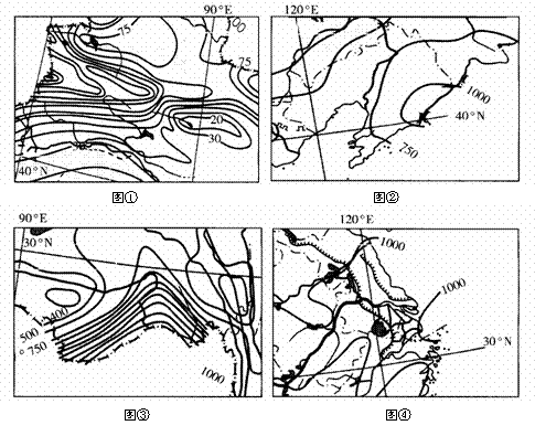 读下图中①、②、③、④四图“两组同纬度地区等降水量线图”,回答17-20题。