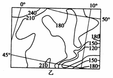 A.纬度比甲地低 B.地势起伏比甲地大 C.海拔比甲地低 D.气候海洋性比甲地强