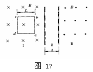 21.如图17所示,I、Ⅱ为两匀强磁场区,I区域的磁场方向垂直纸面向里,Ⅱ区域的磁场方向垂直纸面向外,磁感应强度大小均为B,两区域中间为宽s的无磁场区Ⅱ。有一边长为L(L>s)、电阻为R的正方形金属握abcd置于I区域,ab边与磁场边界平行,现拉着金属框以速度v向右匀速移动。求:
