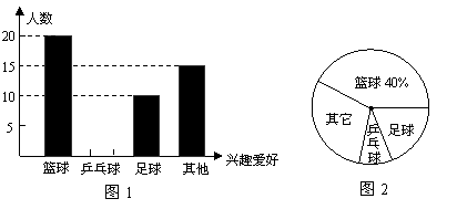 10. 为响应国家要求中小学生每天锻练1小时的号召,某校开展了形式多样的“阳光体育运动”活动,小明对某班同学参加锻炼的情况进行了统计,并绘制了下面的图1和图2,请在图1中将“乒乓球”部分的图形补充完整.