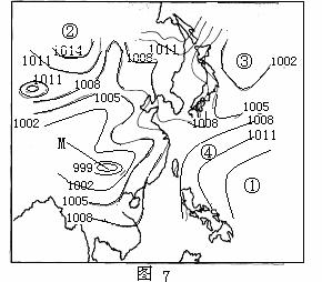 图6 表示亚洲东部某日时地面气压等值线图(单位:百帕)并结合所学知识,回答20-21小题。