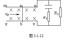 如图5-1-12为某一电路装置的俯视图,mn、xy为水平放置的很长的平行金属板,两板间距为L,板间有匀强磁场,磁感应强度为B,裸导线ab电阻为R0,电阻R1=R2=R,电容器电容C很大,由于棒匀速滑行,一不计重力的带正电粒子以初速度v0水平射入两板间可做匀速直线运动.问: