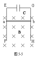 例2 如图5-5电容为C的电容器与竖直放置的金属导轨EFGH相连,一起置于垂直纸面向里,磁感应强度为B的匀强磁场中,金属棒ab因受约束被垂直固定于金属导轨上,且金属棒ab的质量为m、电阻为R,金属导轨的宽度为L,现解除约束让金属棒ab从静止开始沿导轨下滑,不计金属棒与金属导轨间的摩擦,求金属棒下落的加速度.