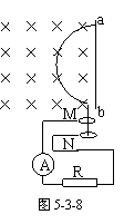 如图5-3-8,一个半径为r的半圆形线圈,以直径ab为轴匀速转动,转速为n,的左侧有垂直纸面向里的匀强磁场(与垂直),磁感应强度为B,M和N是两个集流环,负载电阻为R,线圈、电流表和连接导线电阻不计,求: