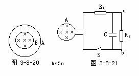 8.如图3-8-21所示,面积为0.2m2的100匝线圈A处在磁场中,磁场方向垂直于线圈平面.磁感强度随时间变化的规律是B=(6-0.2t)T,已知R1=4Ω,R2=6Ω,电容C=3OμF.线圈A的电阻不计.求: