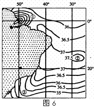 读某地近海盐度(‰)分布状况,如图6,完成10-12小题: