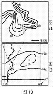 (3)图a是图b阴影部分海湾放大图,请选择①②③④四地中最适宜建港口位置,并说明理由。(6分)