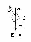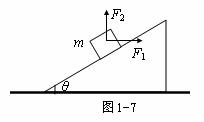 解析:物体受力分析如图1-8所示,以斜面方向和垂直于斜面方向建立直角坐标系,将这些力正交分解。由物体平衡条件可知:F1cosθ+F2sinθ=mg sinθ,而物体要静止在斜面上,必须满足F2≤mg