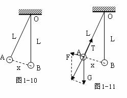 例题3.如图1-10所示,A、B是带有等量的同种电荷的两小球,它们的质量都是m,它们的悬线长度是L,悬线上端都固定在同一点O,B球悬线竖直且被固定,A球在力的作用下,偏离B球χ的地方静止平衡,此时A受到绳的拉力为F,现在保持其他条件不变,用改变A球质量的方法,使A球在距B为