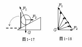 解析:由于挡板是缓慢转动的,可以认为每个时刻小球都处于静止状态,因此所受合力为零。应用三角形定则,G、F1、F2三个矢量应组成封闭三角形,其中G的大小、方向始终保持不变;F1的方向不变;F2的起点在G的终点处,而终点必须在F1所在的直线上,由作图1-18可知,挡板逆时针转动90°过程,F2矢量也逆时针转动90°,因此F1逐渐变小,F2先变小后变大。(当F2⊥F1,即挡板与斜面垂直时,F2最小)