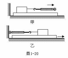 (3)为了测量木块与木板之间的滑动摩擦力,他设计了两种方案,如图1-20甲和乙所示,甲是将长木板固定在水平面上,用弹簧测力计水平拉动木板上的木块;乙是用弹簧测力计水平拉住木块,他水平拉动木块下的木板,你认为更利于操作的方案是______________。理由是____________________。
