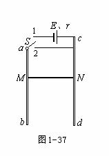 如图1-37所示,在竖直平面内固定有两条平行的金属导轨ab、cd,导轨处在与导轨平面垂直的匀强磁场中,磁感应强度B=0.80T,与导轨相连的电源电动势E=3.0V,内阻r=0.5Ω,水平放置的导体棒MN的电阻R=1.5Ω,两端始终与导轨接触良好,且能沿导轨无摩擦滑动,电路中其他电阻不计。当单刀双掷开关S与1接通时,导体棒刚好保持静止状态,求: