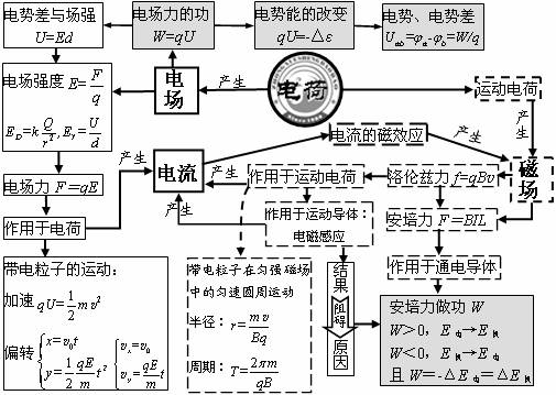“场”的本质源自电荷,电荷的周围存在电场,运动电荷产生磁场,因此知识链条的顶端是电荷;同时电场或磁场又反过来对电荷或运动电荷施加力的作用,体现了知识体系的完整,因果轮回.知识结构如图7-1.分“场”的产生、场对物质(电荷或导体)的作用和能量关系三个版块.