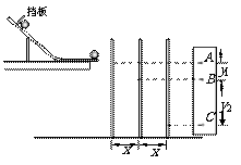 (2)(6分)在做“研究平抛物体的运动”的实验时,为了确定小球在不同时刻所通过的位置,用如图所示的装置,将一块平木板钉上复写纸和白纸,竖直立于槽口前某处且和斜槽所在的平面垂直,使小球从斜槽上紧靠挡板处由静止滚下,小球撞在木板上留下痕迹A;将木板向后移距离x,再使小球从斜槽上紧靠挡板处由静止滚下,小球撞在木板上留下痕迹B;又将木板再向后移距离x,小球再从斜槽上紧靠挡板处由静止滚下,再得到痕迹C.若测得木板每次后移距离x=20.00cm,A、B间距离y1 =4.70cm,B、C间距离y2 =14.50cm.(g取9.80m/s2)