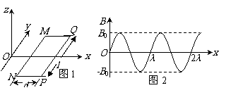 例题1.(2008年天津理综25题)磁悬浮列车是一种高速低耗的新型交通工具。它的驱动系统简化为如下模型,固定在列车下端的动力绕组可视为一个矩形纯电阻金属框,电阻为R,金属框置于xOy平面内,长边MN长为l,平行于y轴,宽为d的NP边平行于x轴,如图1所示。列车轨道沿Ox方向,轨道区域内存在垂直于金属框平面的磁场,磁感应强度B沿Ox方向按正弦规律分布,其空间周期为λ,最大值为B0,如图2所示,金属框同一长边上各处的磁感应强度相同,整个磁场以速度v0沿Ox方向匀速平移。设在短暂时间内,MN、PQ边所在位置的磁感应强度随时间的变化可以忽略,并忽略一切阻力。列车在驱动系统作用下沿Ox方向加速行驶,某时刻速度为v(v<v0)。