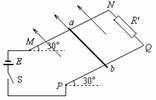 例题4.如图所示,MN、PQ为平行光滑导轨,其电阻忽略不计,与地面成30°角固定.N、Q间接一电阻R′=10Ω,M、P端与电池组和开关组成回路,电动势E=6V,内阻r=1.0Ω,导轨区域加有与两导轨所在平面垂直的匀强磁场.现将一条质量m=10g,电阻R=10 Ω的金属导线置于导轨上,并保持导线ab水平.已知导轨间距L=0.1m,当开关S接通后导线ab恰静止不动.