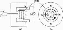 例题5.如图所示,(a)是某人设计的一种振动发电装置,它的结构是一个半径为r=0.1 m的有20匝的线圈套在辐向形永久磁铁槽中,磁场的磁感线均沿半径方向均匀分布[其右视图如图(b)].在线圈所在位置磁感应强度B的大小均为0.2 T.线圈的电阻为2Ω,它的引出线接有8Ω的电珠L,外力推动线圈的P端,作往复运动,便有电流通过电珠.当线圈向右的位移随时间变化的规律如图所示时(x取向右为正):