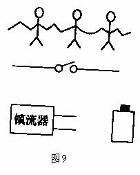 12. 有一个被称为“千人震”的趣味物理小实验,实验是用一节电动势为1.5V的新干电池,几根导线,开关和一个用于日光灯上的镇流器,几位做这个实验的同学手拉手成一串,另一同学将电池、镇流器、开关用导线将它们首、尾两位同学两个空着的手相连, 如图9所示,在开关通或断时,就会连成一串的同学都有触电感觉,该实验原理是 ;人有触电感觉时开关是接通还是开关是断开的瞬间 ,因为 。