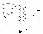 13. 如图10所示,水平铜盘半径为r,置于磁感强度为B,方向竖直向下的匀强磁场中,铜盘绕过中心轴以角速度ω做匀速圆周运动,铜盘的中心及边缘处分别用滑片与一理想变压器的原线圈相连,理想变压器原副线圈匝数比为n,变压器的副线圈与一电阻为R的负载相连,则变压器原线圈两端的电压为______________,通过负载R的电流为____________。