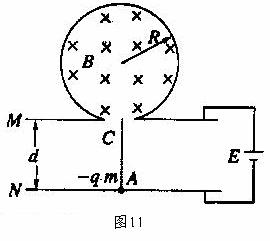14. 如图11所示在半径为R的绝缘圆筒内有匀强磁场,方向垂直纸面向里,圆周正下方有小孔C与平行金属板M、N相通,两板间距为d,两板与电动势为E的电源连接,一带电量为-q、质量为m的带电粒子(重力忽略不计),开始时静止于C孔正下方紧靠N板的A点,经电场加速后从C孔进入磁场,并以最短的时间从C孔射出。已知带电粒子与筒壁的碰撞无电量损失,且每次碰撞时间极短,碰后以速率返回,求: