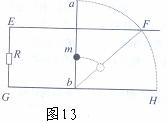 如图13所示,平行的光滑金属导轨EF和GH相距L,处于同一竖直平面内,GE间解有阻值为R的电阻,轻质金属杆ab长为2L,近贴导轨数值放置,离b端0.5L处固定有质量为m的小球,整个装置处于磁感应强度为B并与导轨平面垂直的匀强磁场中,当ab杆由静止开始紧贴导轨绕b端向右倒下至水平位置时,球的速度为v,若导轨足够长,导轨及金属杆电阻不计,求在此过程中: