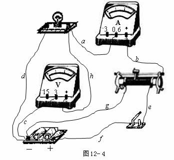 例3(07年重庆)在“描绘小灯泡的伏安特性曲线”实验中用导线a、b、c、d、e、f、g和h按图12-4所示方式连接电路,电路中所有元器件都完好,且电压表和电流表已调零。闭合开关后: