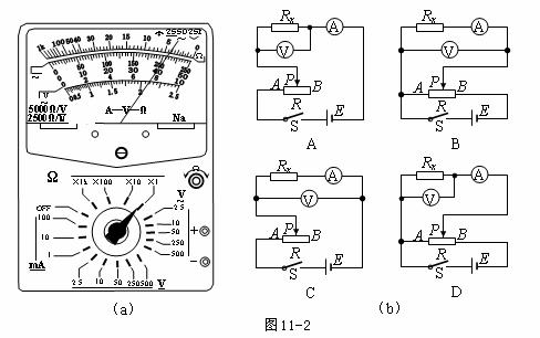 ⑵根据多用电表示数,为了减少实验误差,并在实验中获得较大的电压调节范围,应从图11-2(b)的A、B、C、D四个电路中选择_________电路来测量金属丝电阻;