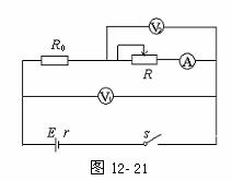 该同学想在完成学生实验“测电源电动势和内阻”的同时测出定值电阻R0的阻值,设计了如图12-21所示的电路。实验时他用U1、U2、I分别表示电表V1、V2、A的读数。在将滑动变阻器的滑片移动到不同位置时,记录了U1、U2、I的一系列值. 其后他在两张坐标纸上各作了一个图线来处理实验数据,并计算了电源电动势、内阻以及定值电阻R0的阻值。