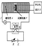 (16分)如图所示是测量通电螺线管A内部磁感应强度B及其与电流I关系的实验装置。将截面积为S、匝数为N的小试测线圈P置于螺线管A中间,试测线圈平面与螺线管的轴线垂直,可认为穿过该试测线圈的磁场均匀。将试测线圈引线的两端与冲击电流计D相连。拨动双刀双掷换向开关K,改变通入螺线管的电流方向,而不改变电流大小,在P中产生的感应电流引起D的指针偏转。