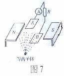 目前,世界上正在研究一种新型发电机叫磁流体发电机,如图7所示表示出了它的原理:将一束等离子体(即高温下电离的气体,含有大量带正电和负电的微粒,而从整体来说呈中性)喷射入磁场,磁场中有两块金属A、B,这时金属板上就会聚集电荷,产生电压,如果摄入的等离子体的初速度为v,两金属板的板长(沿初速度方向)为L,板间距离为d,金属板的正对面积为S,匀强磁场的磁感应强度为B,方向垂直于离子初速度方向,负载电阻为R,电离气体充满两板间的空间,当发电机稳定发电时,电流表的示数为I,那么板间电离气体的电阻率为( )