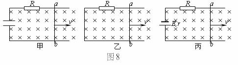 10. 如图8所示,甲图中的电容器C原来不带电,除电阻R外,其余部分电阻均不计,光滑且足够长的导轨水平放置,现给导体棒ab水平向右的初速度v,则甲、乙、丙三种情形下ab棒最终的运动状态是( )