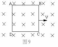 11. 一正方形线圈在匀强磁场中向右做加速运动,如图9所示,已知正方形的边长为L,磁场范围足够大,磁感应强度为B,某时刻线圈速度为V,则线圈回路中感应电动势为 ,感应电流为 ,BC两端的电势差为 ,AB两端的电势差为 。